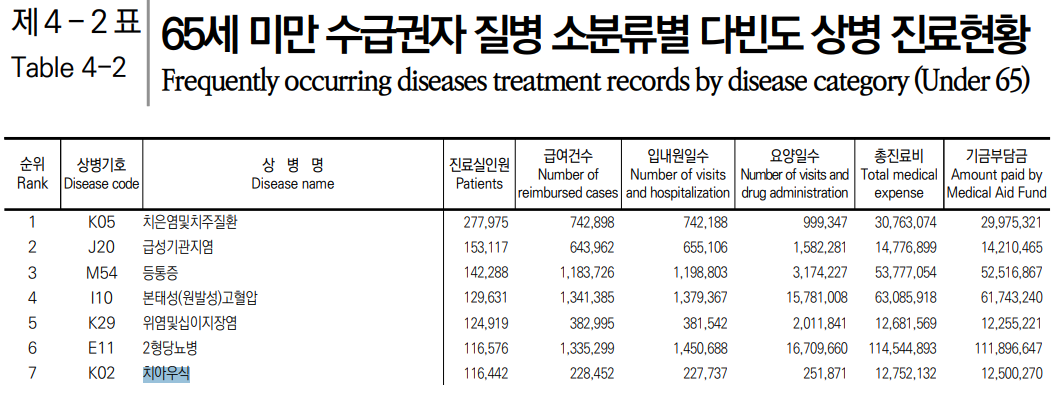 2021년 의료급여 통계에 따르면 치아우식(흔히 말하는 충치)으로 인한 외래치료는 전체 순위 중 7위에 해당하고 있습니다. 그리고 그 위에 첫 번째에 해당하는 치은염 및 치주질환의 경우 1위를 기록하고 있을 만큼 많은 분들이 치과진료를 받고 있습니다.